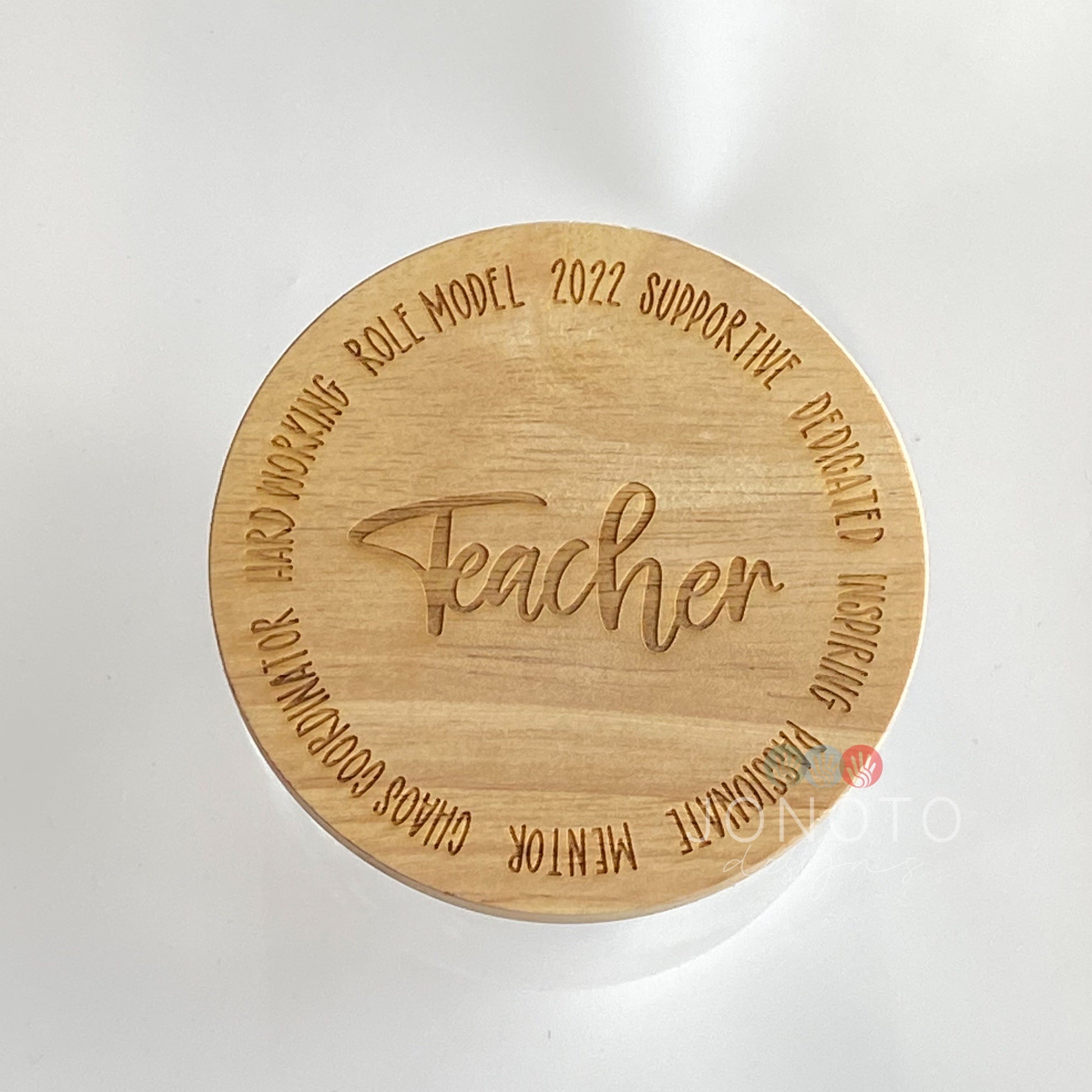 The wooden jar lid is laser engraved with the design of your choice, and can be personalised with teacher and child's name, just add details to the comment box. Don't wish to personalise, that is fine, just leave the comment box blank.