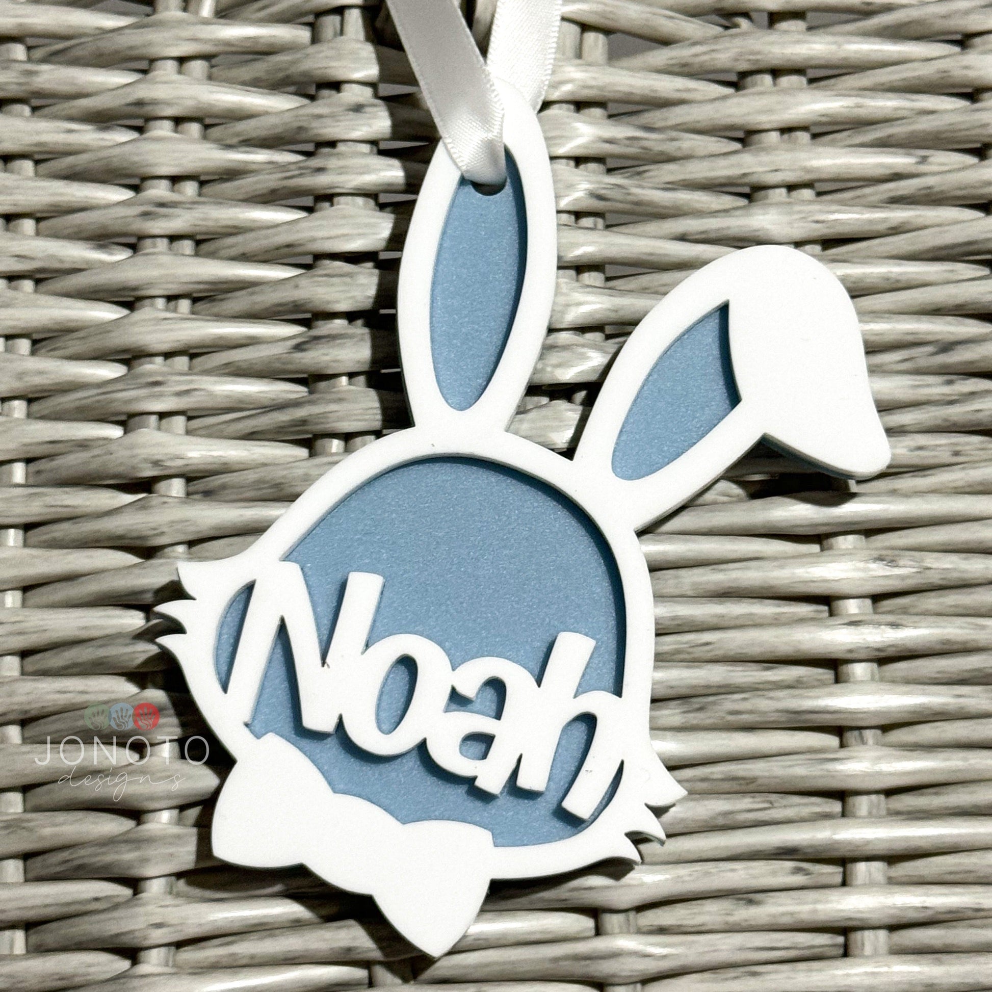 Bunny face shape with a bowtie crafted from double-layered 3mm acrylic, with a matte finish. You can choose the background colour, and the top layer will be white, it follows the same design and font as shown.